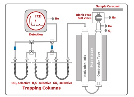 氧元素分析套件。以熱裂解1150°C之爐溫, 將氧轉化為CO並以TCD或選配的IR進行檢測。