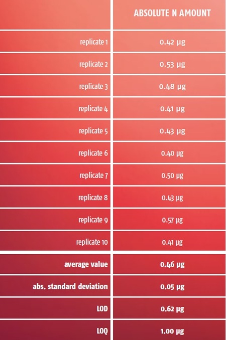 以10個土壤樣本重複分析的絕對氮濃度值取平均值,計算絕對標準差。基於這些數值,計算出UNICUBE®微量的LOD和LOQ:
