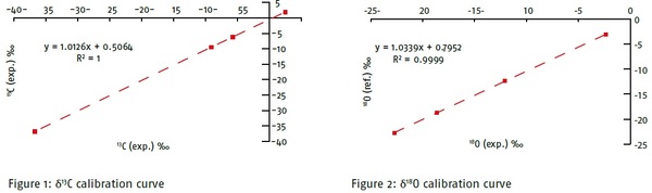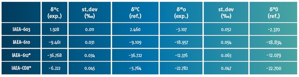 表1:碳酸鹽標準品的實驗(exp.)和參考(ref.)δ13C和δ18O值及其精確度。