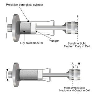 第一個轉換因子(計算因子)是根據幾何形狀和機械耦合關係推導出來的,它將柱塞運動與樣品室體積關聯起來,就好像樣品形狀沒有影響一樣。第二個因子(調整因子)經過修正,包含了從許多不同形狀的樣本中實驗確定的平均形狀影響。這兩個因子都不太可能精確地適用於任何特定的樣品。只有使用目標材料代表性樣本的預定包裹密度,才能達到真正的形狀校正。