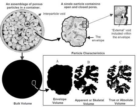 包裹密度 (Envelope density)由樣品質量和包裹體積計算得出,包裹體積是指包含開放孔隙和封閉孔隙的體積。該體積使用一種名為 DryFlo® 的非侵入性、自由流動的乾粉介質進行分析,該介質被限制在一個圓柱樣品室中,樣品室的直徑有五種,從 12.7 mm(0.5 英寸)到 50.8 mm(2.0 英寸)。試樣的體積是透過從同一樣品室中加入試樣後相同固結DryFlo材料的體積(試驗運行)中減去空白試驗中固結DryFlo材料的體積來確定的。介質床透過旋轉和振動進行攪拌,並且在試驗的兩個階段中,固結力均逐漸增加至相同的設定值。
