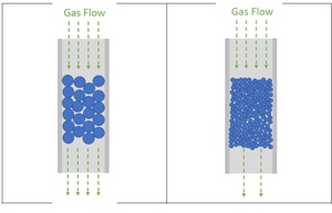 當氣體流動受到顆粒本身的阻礙時,樣品管柱中就會發生壓力降,導致塔下游壓力低於上游壓力。壓力降的產生是因為顆粒間的空隙太小,無法容納氣體到達樣品管柱出口所需的曲折路徑。下圖1展示了這種效應。