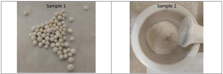 製備了兩個沸石13X樣品,用於在常壓和30 °C下,以50/50的二氧化碳和氮氣混合氣流進行二氧化碳吸附實驗。下圖3展示了這兩個樣品。樣品1為直接分析的沸石13X顆粒。樣品2為破碎並篩選至小於40目(0.42 mm)的沸石13X顆粒。在分析前,兩個樣品均在氮氣流速為 20 ml/min、壓力為 1.0 bar、溫度為 200 °C 的條件下活化 12 小時。使用流速分別為 7 ml/min 的氮氣、7 ml/min 的二氧化碳和 1 ml/min 的氦氣對樣品進行二氧化碳吸附分析。