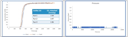 圖 5。 (左)13X 沸石碎屑的穿透吸附曲線;(右)穿透實驗過程中的系統壓力