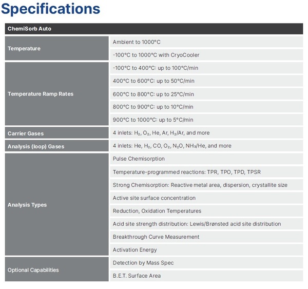 Micromeritics ChemiSorb Auto是一款緊湊型全自動化學吸附分析儀,專為異質觸媒的分析而設計,能夠提供高精度且可重複的測試結果。ChemiSorb Auto可達到±1%的重複性精度、超低的死體積以及完全自動化的工作流程。無論您是進行程式升溫吸附實驗還是脈衝化學吸附分析,ChemiSorb Auto都能提供可靠的性能以及卓越的易用性符合您的多用途需求。